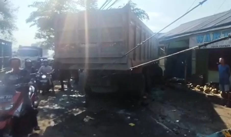 Lalu, truk Dump Hino terus bergerak ke kanan jalan dan menabrak bangunan yang berada di sebelah kanan.
