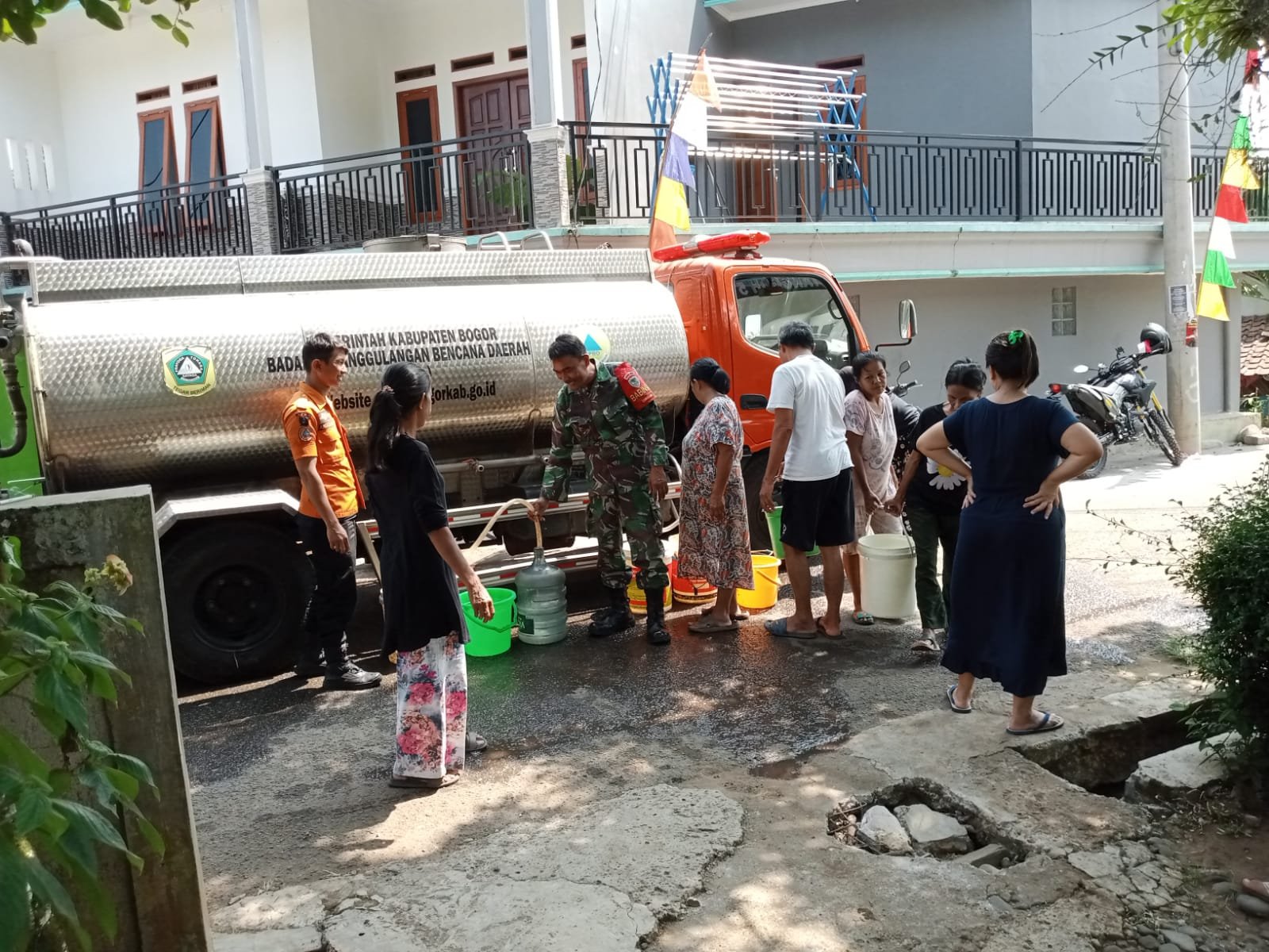 Masih kata Sertu Fred Arnold, pengiriman air sudah sudah dua kali dari BPBD Kabupaten Bogor, sangat dirasakan langung oleh warga di Desa Cimulang. Mereka berbondong-bondong warga membawa tempat untuk mengisi air bersih.
