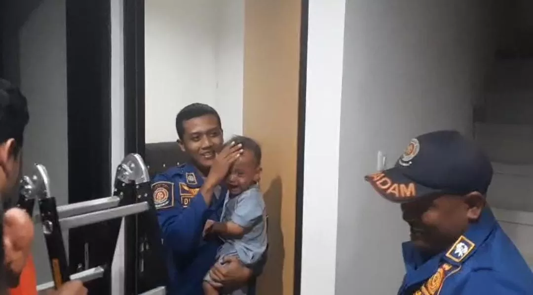 Zakaria menyebut, evakuasi balita yang terkunci di dalam kamar itu anggotanya menggunakan tangga dengan masuk ke lubang ventilasi atas pintu.