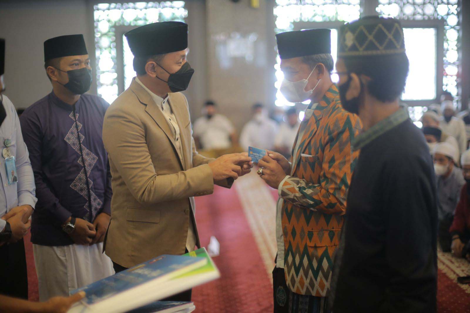 Wali Kota Bogor, Bima Arya menyerahkan kartu ATM BJB dan kartu BPJS Ketenagakerjaan kepada 600 guru ngaji dari perwakilan setiap kecamatan sebanyak 100 orang di Masjid Raya Bogor, Jalan Pajajaran, Kota Bogor, Selasa (22/3/22).
