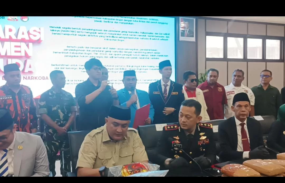 Cibinong, BogorUpdate.com – Dalam momentum peringatan Hari Sumpah Pemuda, Selasa (28/10/25), sejumlah organisasi kepemudaan dan ormas di Kabupaten Bogor yang tergabung dalam Komite Nasional Pemuda Indonesia (KNPI) Kabupaten Bogor menggelar deklarasi gerakan anti narkoba di Mako Polres Bogor.