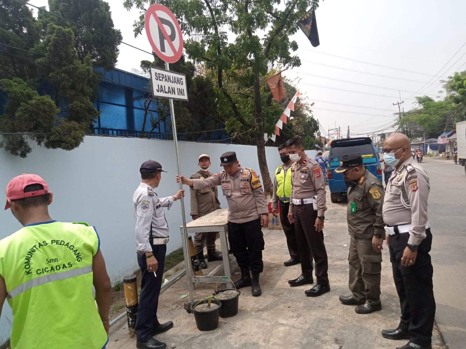 Polsek Gunung Putri bersama-sama dengan Dishub Kabupaten Bogor, Koramil 0621-05/Gn Putri Satpol PP Kecamatan Gunung Putri, dan Linmas Desa Cicadas, memasang rambu dilarang parkir dan rambu hati-hati, didepan PT. Simone.