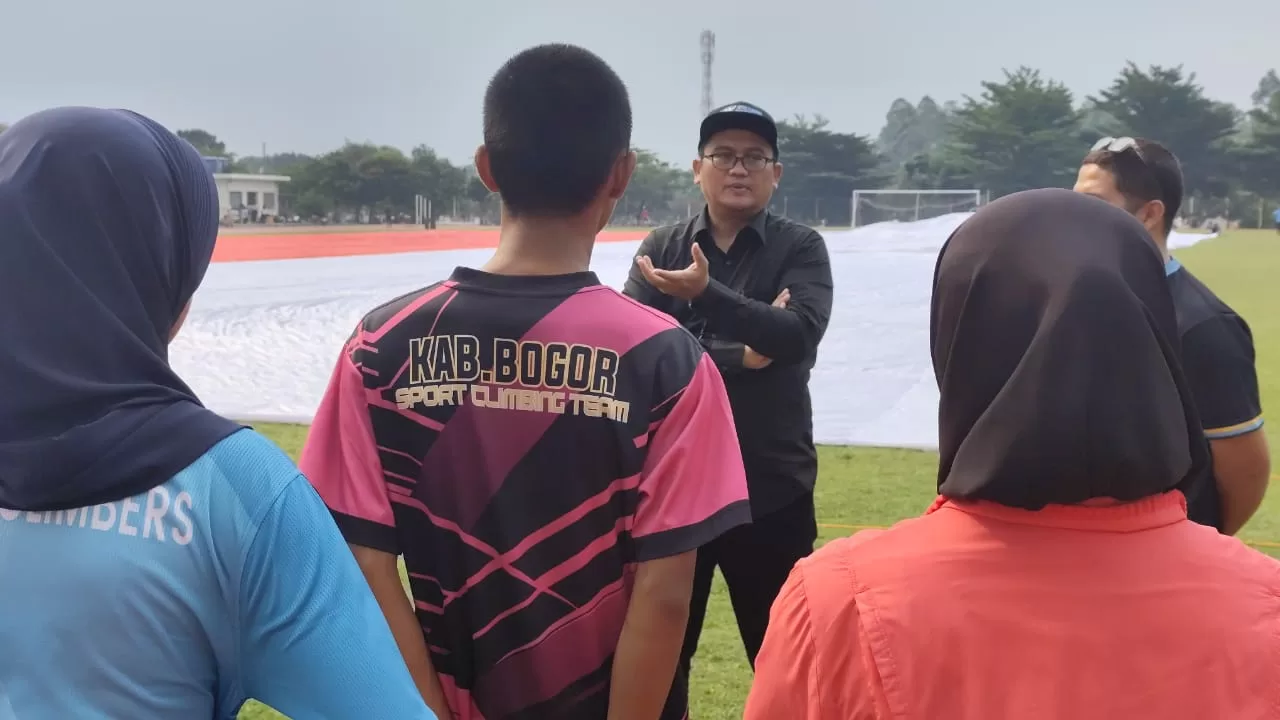 Olahraga, BogorUpdate.com – Ketua FPTI Kabupaten Bogor, Trian Turangga memberikan motivasi atau support kepada enam Climber (atlet panjat tebing) pelajar binaan UPT PPOPM Dispora Kabupaten Bogor saat berlatih fisik di Lapangan PASI Kabupaten Bogor, Selasa (5/8/25).