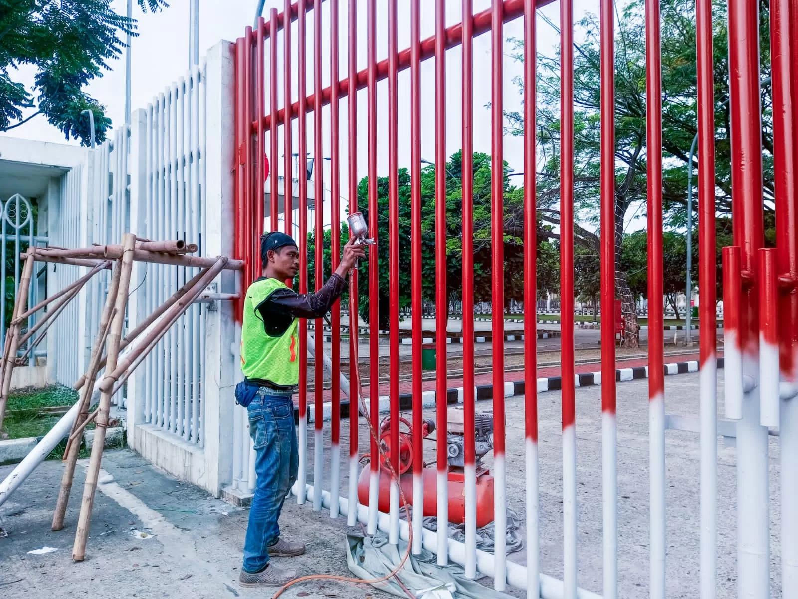 Proses pengecetan ulang pagar Stadion Pakansari yang telah berkarat dengan warna merah putih jelang HUT RI ke-80. (Foto: Erwin)