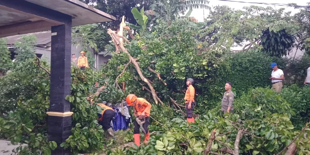 Kemang, BogorUpdate.com – Hujan deras disertai angin kencang yang melanda wilayah Kecamatan Kemang, Kabupaten Bogor, Senin (3/11), menyebabkan sebuah pohon duku tumbang dan menimpa atap rumah warga di Desa Jampang.