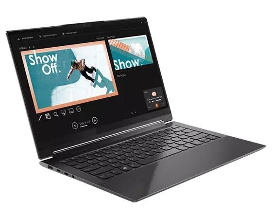 Yoga 9i menjadi perangkat hiburan portabel dan pembuatan konten. Laptop ini memiliki layar sentuh 14-inci 16:10 hingga 4K OLED PureSight, dilengkapi dengan audio dari Sound by Bowers & Wilkins.
