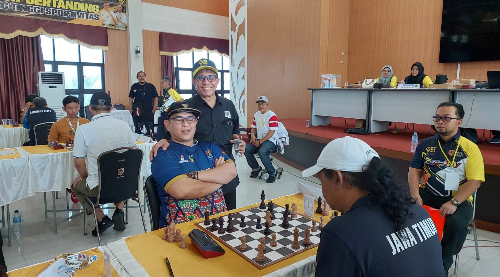 Meski tampak gugup, Zulmansyah berusaha tetap fokus pada permainan caturnya. Sementara itu, para atlet, juri, dan panitia di sekitar arena catur tetap menjalankan tugas mereka dengan serius, meskipun beberapa tersenyum melihat pertemuan tersebut.