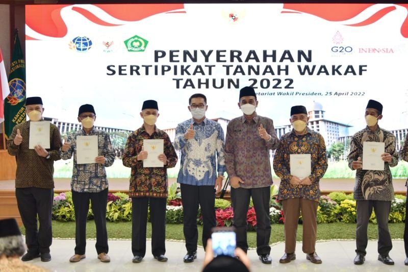 Ridwan Kamil menyerahkan sertipikat tanah wakaf tersebut bersamaan dengan Wakil Presiden Ma’ruf Amin yang menerahkan 3.152 sertipikat tanah wakaf di seluruh Indonesia.